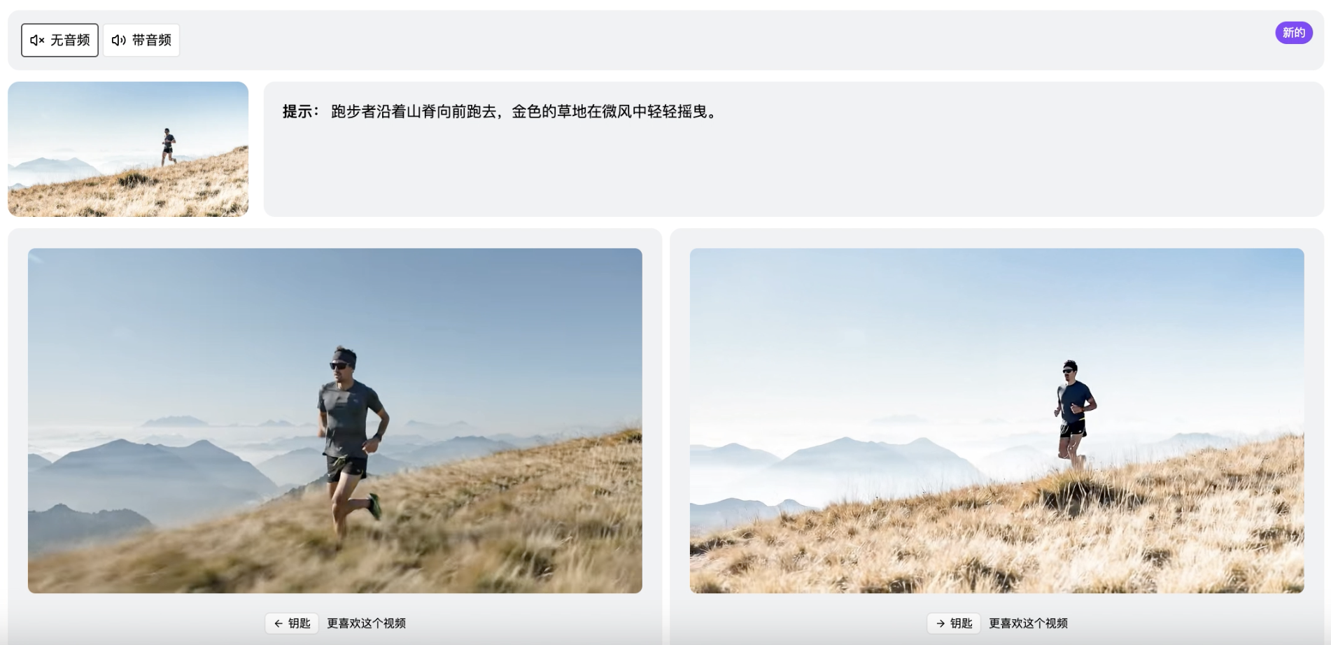 时代财经注意到,在“跑步者沿着山脊向前跑去,金色的草地在微风中轻轻摇曳”的提示下,HappyHorse生成视频在人物形态、动作真实感以及画面质感上表现突出,整体色彩饱和、氛围感强。但与此同时,其运镜相对克制,人物和山脊的镜头呈现角度较为单一。