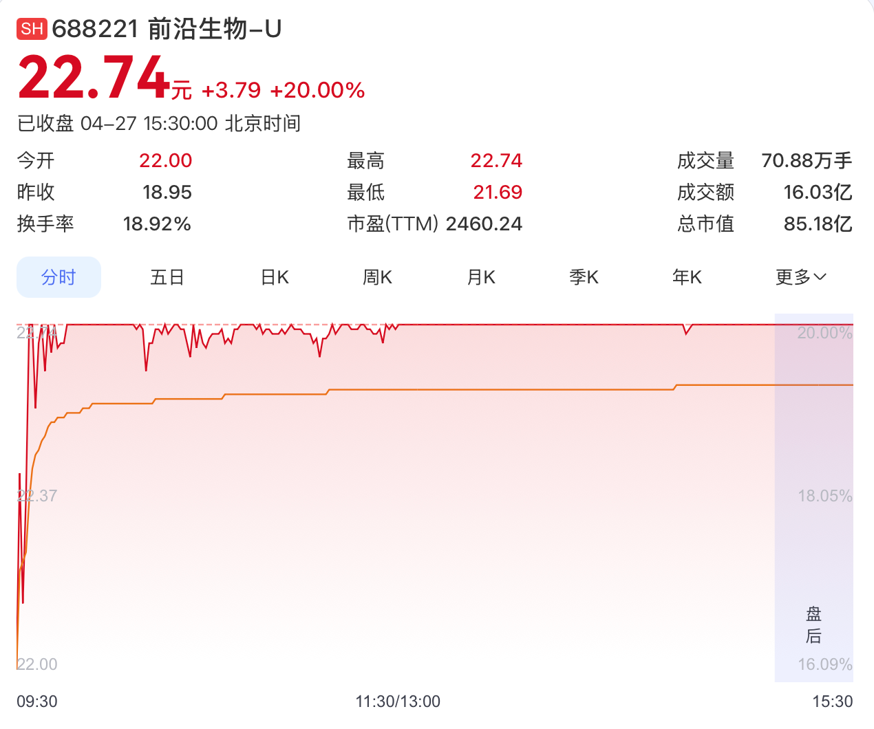 4月27日,在医药股普遍承压、板块整体走弱的背景下,创新药企前沿生物(688221.SH)却逆势爆发,开盘后快速拉升触及20%的涨停板,截至收盘,前沿生物涨停封板,报22.74元/股。