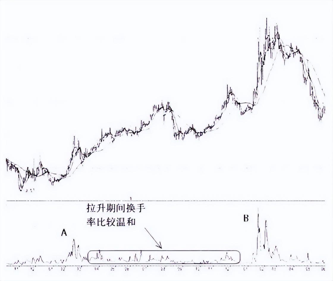 如图1-3所示,皖通高速(600012)图中A位置换手率的放大对应着股价的底部,这正是庄家建仓所在的价位。而图中B位置恰好是庄家拉升出货的位置。为什么这么说呢?因为庄家放大换手率建仓和出货的动作简直是太明显不过了。通过分析换手率,庄家的行踪就一目了然了。