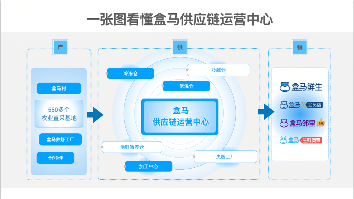 经过这些年的建设,目前在生产环节,盒马已签约550多个农业直采基地、其中有100多个“盒马村”。供应环节,盒马则有56个常温和冷链仓、22个加工中心,10个活鲜暂养仓;销售环节,盒马已开出300多家门店,覆盖全国27个城市。