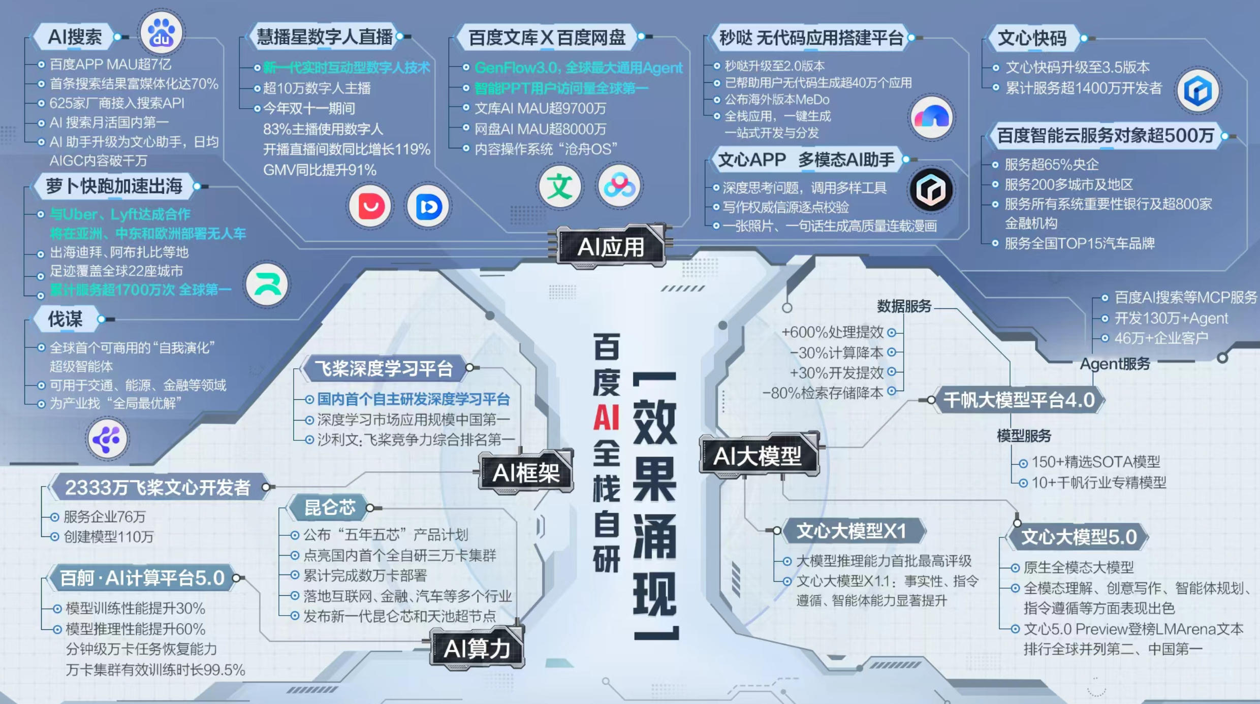 其次,内化AI的战略升维,让AI成为原生动能。如果说早期的AI布局是筑基,那么2025年百度世界大会所倡导的“内化AI”则是结丹。李彦宏明确指出:“只有当AI被内化为一种原生的能力,才能真正在各行各业实现效果的涌现。”这一判断超越了单纯的技术的简单叠加,而是指出了现在AI应用的核心难点,如何让AI真正融入生产生活的方方面面,而不是停留在“两张皮”的表面结合。