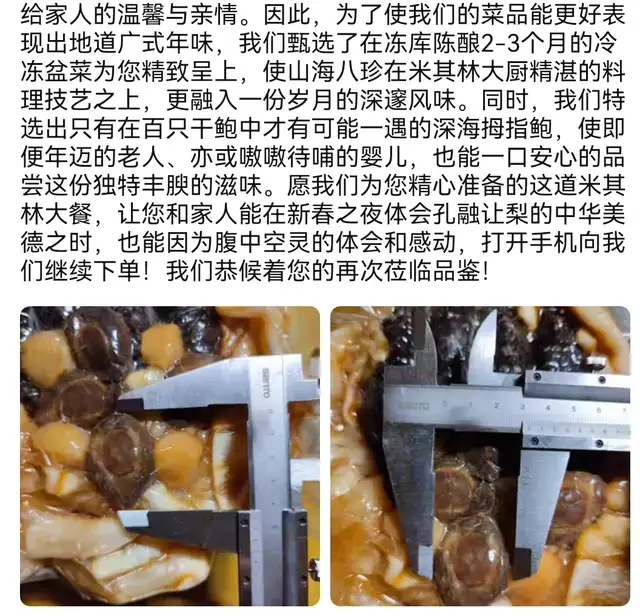因为喜欢这款传统盆菜,有网友做好后拿出游标卡尺,亲测鲍鱼大小,还给店家贡献了一套宣传文案。