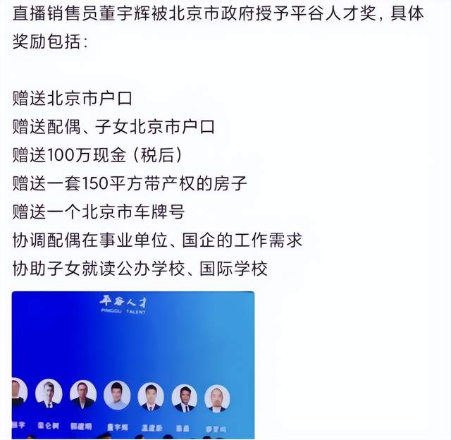 一条是东方甄选的董宇辉,被北京平谷区奖励了一套“豪华大礼包”: