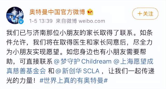 最后,中国奥特曼官方联系上了男孩的父母和所在医院的医务人员,完成了愿望。