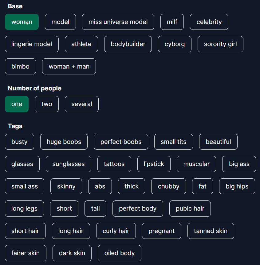 用户不需要输入任何文字,只需要选择标签,就可以定制年龄、身材、表情、人数、人种、姿势、场景、角度、服饰、风格,最终生成像照片一样的大尺度图片。