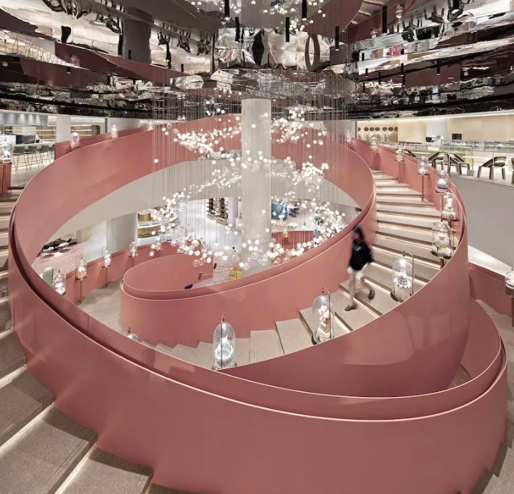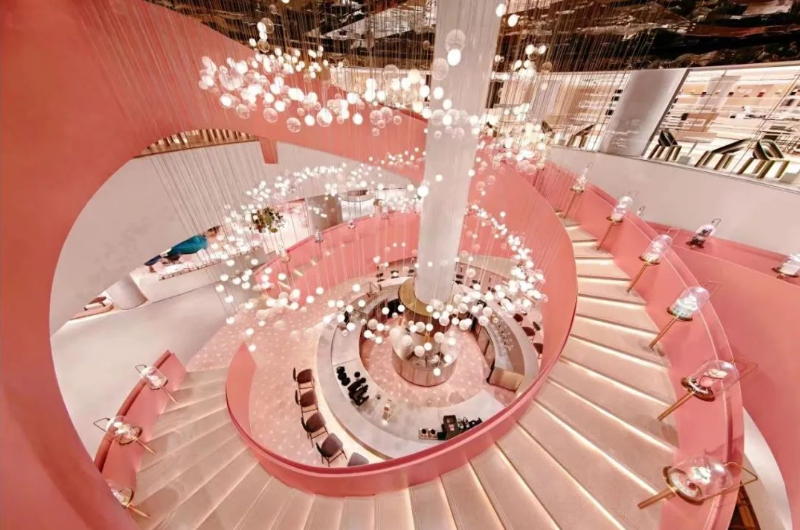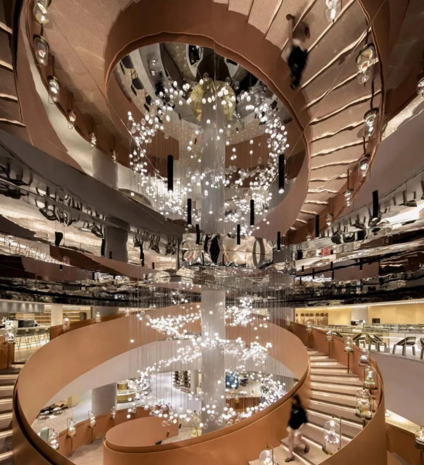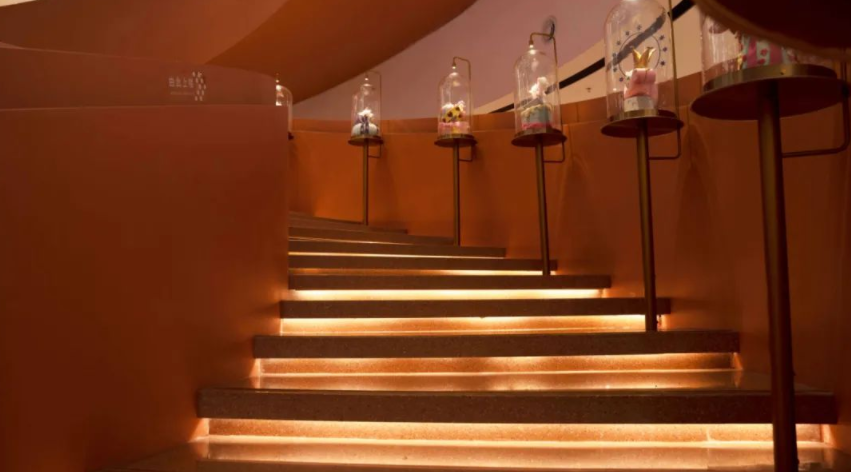 从一楼至二楼设计成旋转楼梯,参考了莫比乌斯环,楼梯上方悬挂着“一千零一个愿望”的吊灯,是一进门的颜值绝杀时刻。