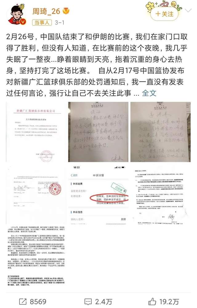 2021年,篮协和CBA选择站队新疆男篮,周琦直接退赛,跑到海外打球。周琦的经纪人在微博表示,CBA联盟相关部门在保护球员权益上,“业余程度”令人震惊失望。