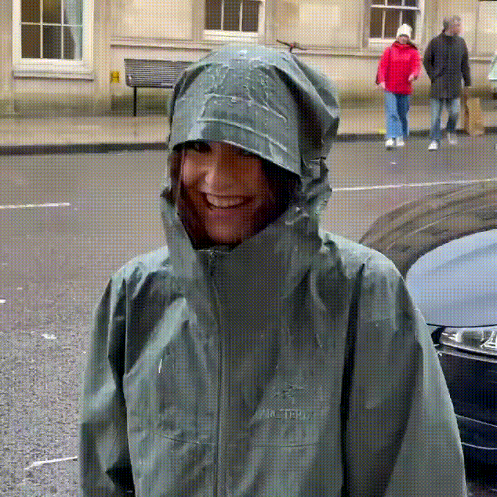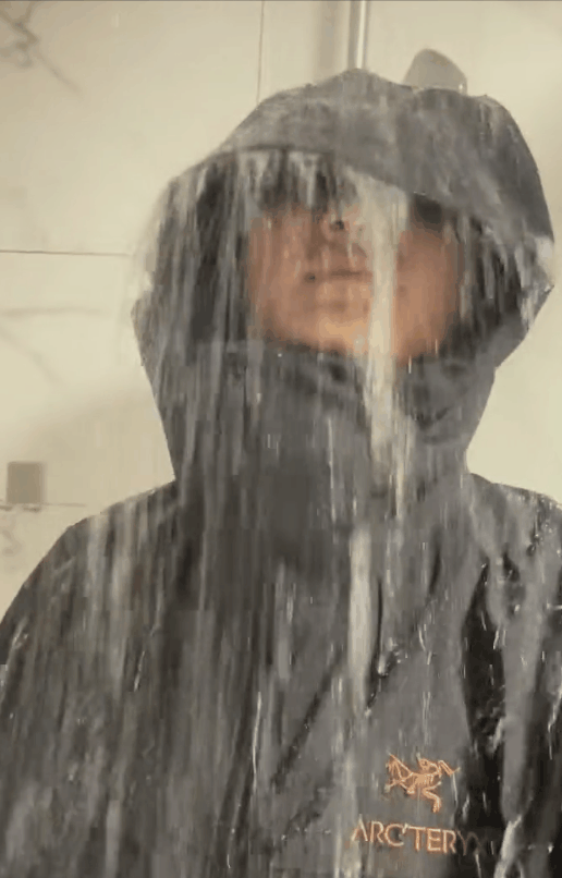 于是他拍摄了几段视频,包括把袖子放在水龙头下,把一杯水倒在帽子上,穿着冲锋衣淋浴,最后跳进游泳池。