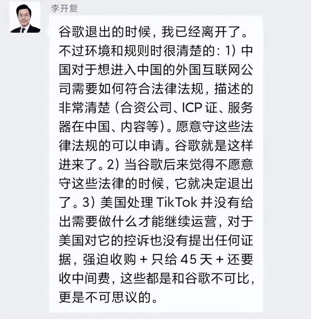 李开复最近就解释,当年谷歌是因为不愿遵守中国法律,自己退出了中国。发生在谷歌和TikTok身上的事,可谓两码事。