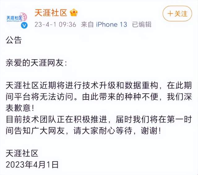 今年4月份,天涯社区发布公告,说因技术升级平台无法访问。