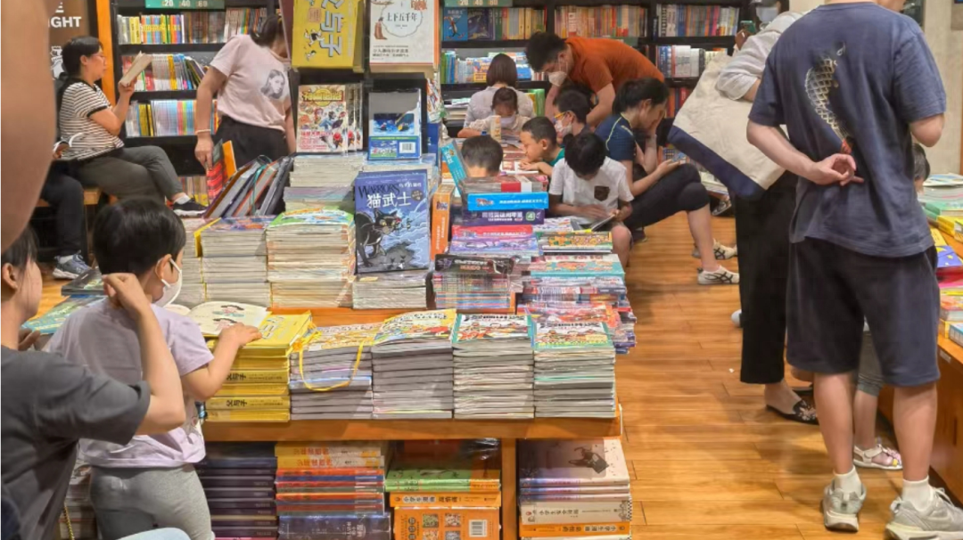 就连商场里的书店,都能挤到站着、蹲着、坐着全满。