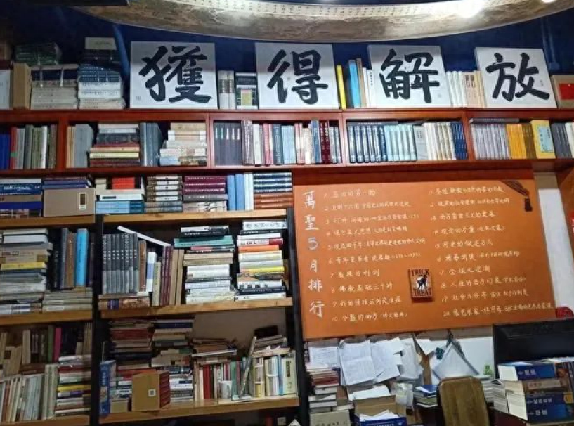 书店入口处的墙上贴着巨大的标语:“通过阅读,获得解放。”