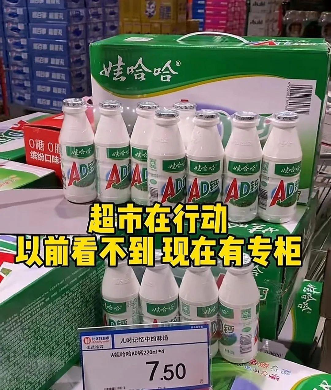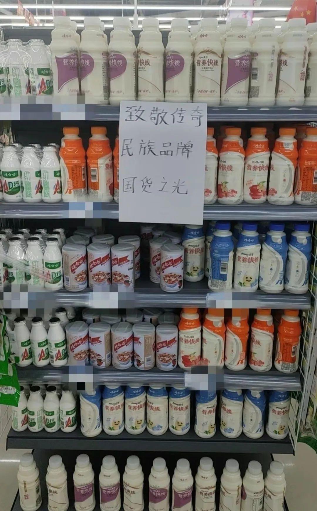 有超市在娃哈哈的货架上,贴上了有“致敬传奇,民族品牌,国货之光”字样的A4纸。