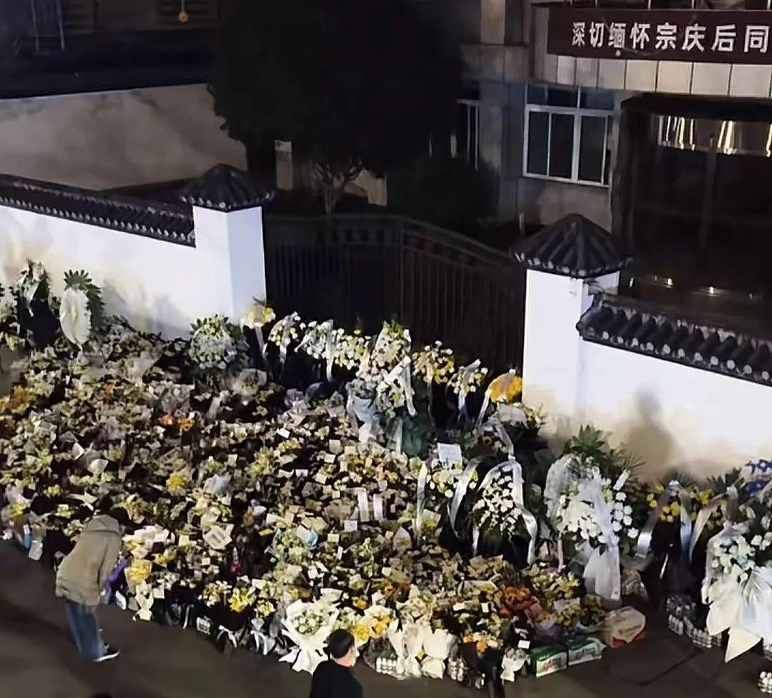 宗庆后离世当天,娃哈哈的旧总部大楼摆满了市民以及各行各业人士送来的鲜花、AD钙奶和营养快线。