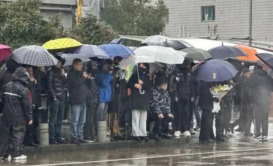 追悼会当天,早在清晨,人们就自发地在路边站成长长的两列,沉默伫立,在冷雨中送别。