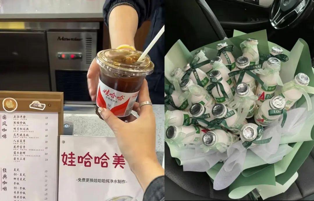 娃哈哈产品成了网红产品。网友喝着“娃哈哈冰美式”,送着“AD钙奶花束”。