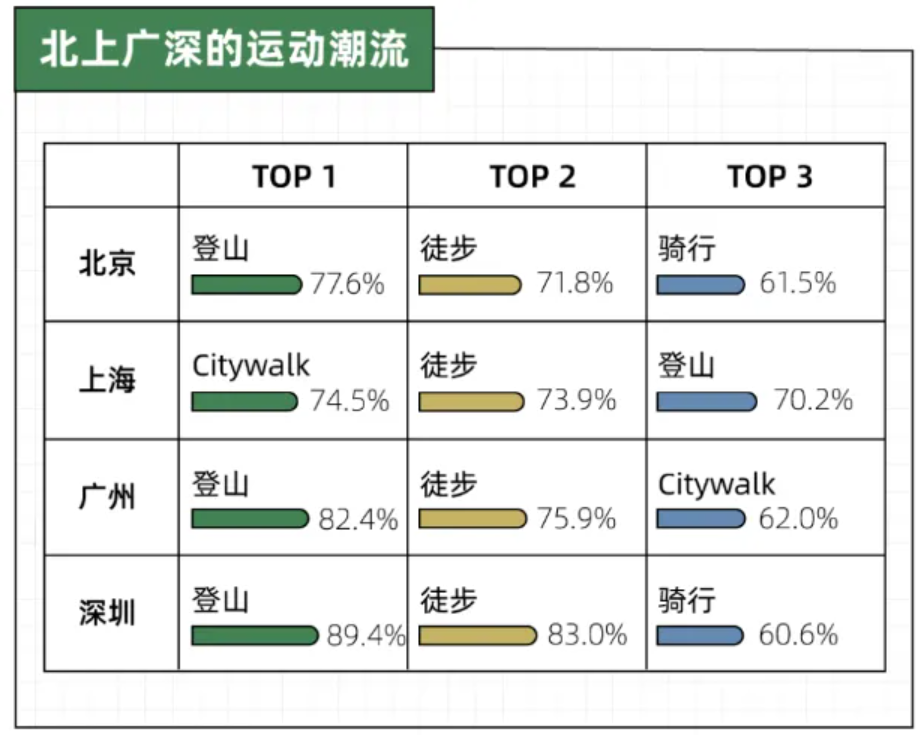 今年的爬山爆火之猛让很多景区紧急限流,在北上广深四大城市的调查中,潮流运动第一名有三个都是“登山”: