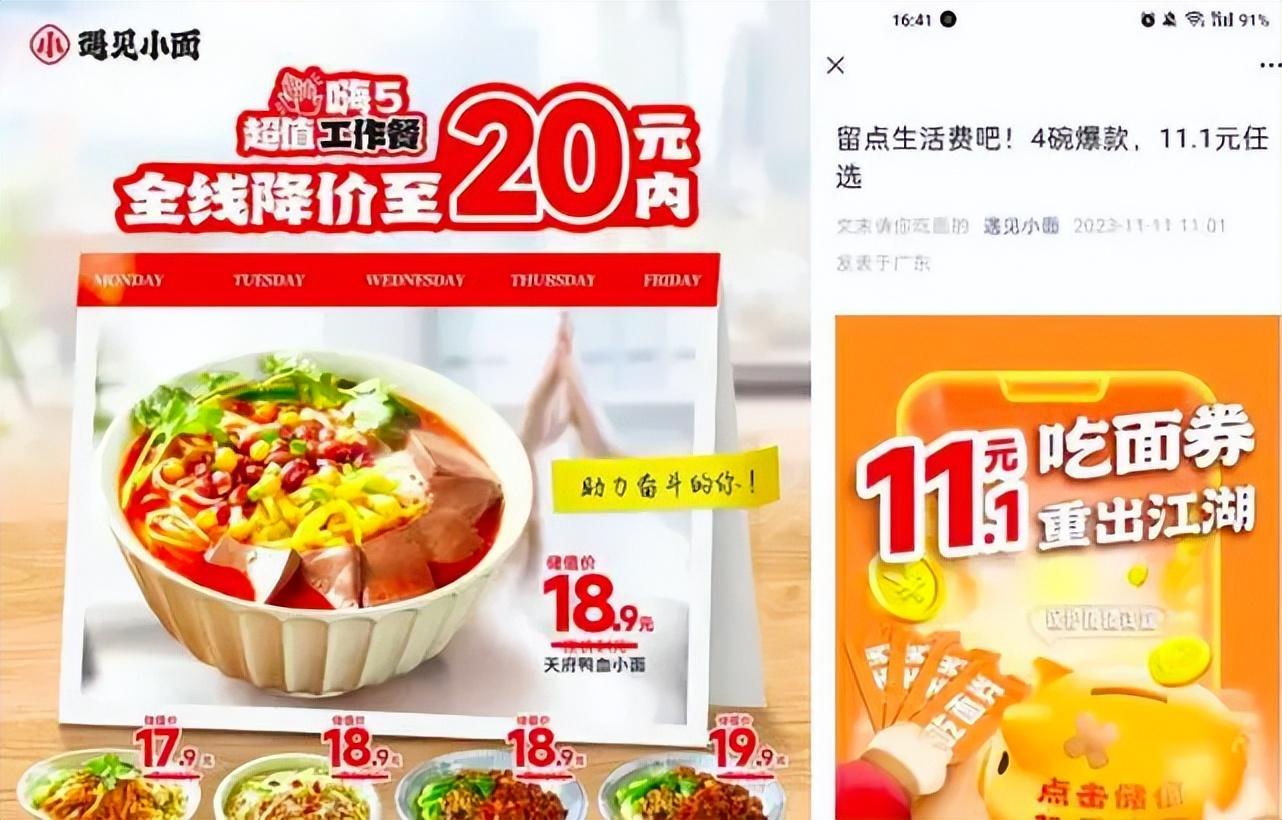 遇见小面更是价格战打到飞起:全线产品售价降至20元内,还陆续推出11.1元吃面券、9.9下午茶等营销活动,直指醉面腹地。