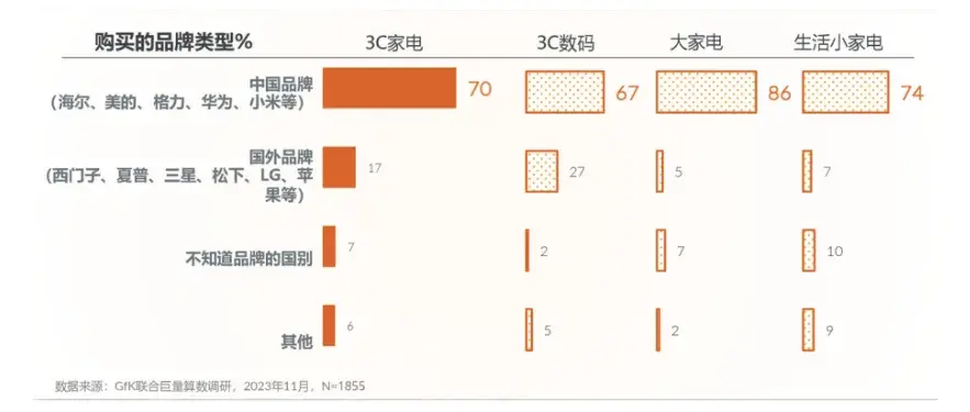 据Gfk联合巨量算数的调研数据显示,消费者在购买手机、大家电、小家电的过程中,70%的3C家电消费者会选择中国品牌,其中大家电品类中选择中国品牌的用户占比最高,达到86%,小家电其次。