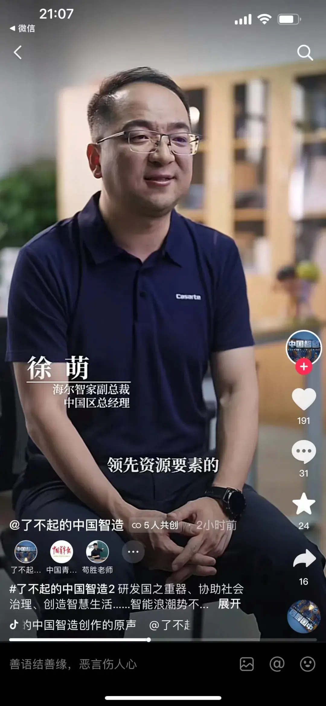 此外,由专家学者、技术大咖及科普博主多方参与的高燃主题片《智造星图》中,中国科学院院士刘嘉麒、国家杰出青年科学基金获得者韩红桂、长江学者特聘教授段海滨、同济大学退休教授吴於人(网名:不刷题的吴姥姥)、西安航空学院青年教师梁辰毅(网名:苟胜老师)、主持人张蕾、海尔智家副总裁兼中国区总经理徐萌等嘉宾,生动阐述了他们眼中的“中国智造”,传递了新时代下中国制造业数智化转型的澎湃动力,进行站台助阵、专业背书的同时,为项目预热。