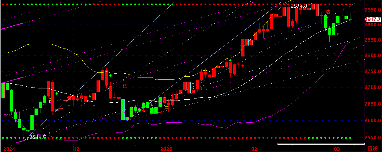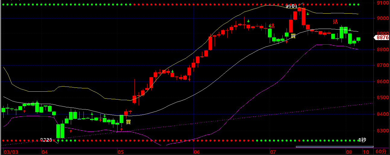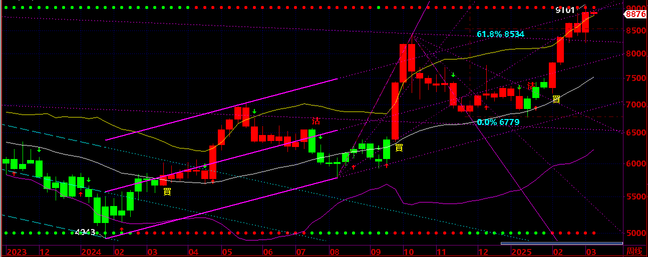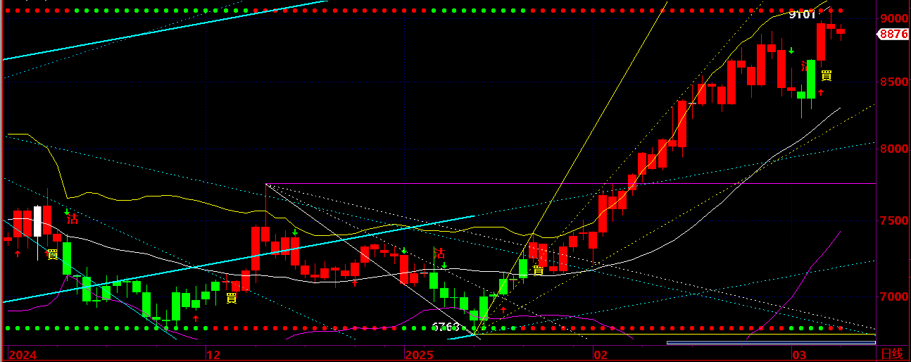 ==》保持8900--9010之上,才有機會 中長線有機會見 9410、9730、10750--850左右;(03.07 高見 9101回吐,收盤8876。。)