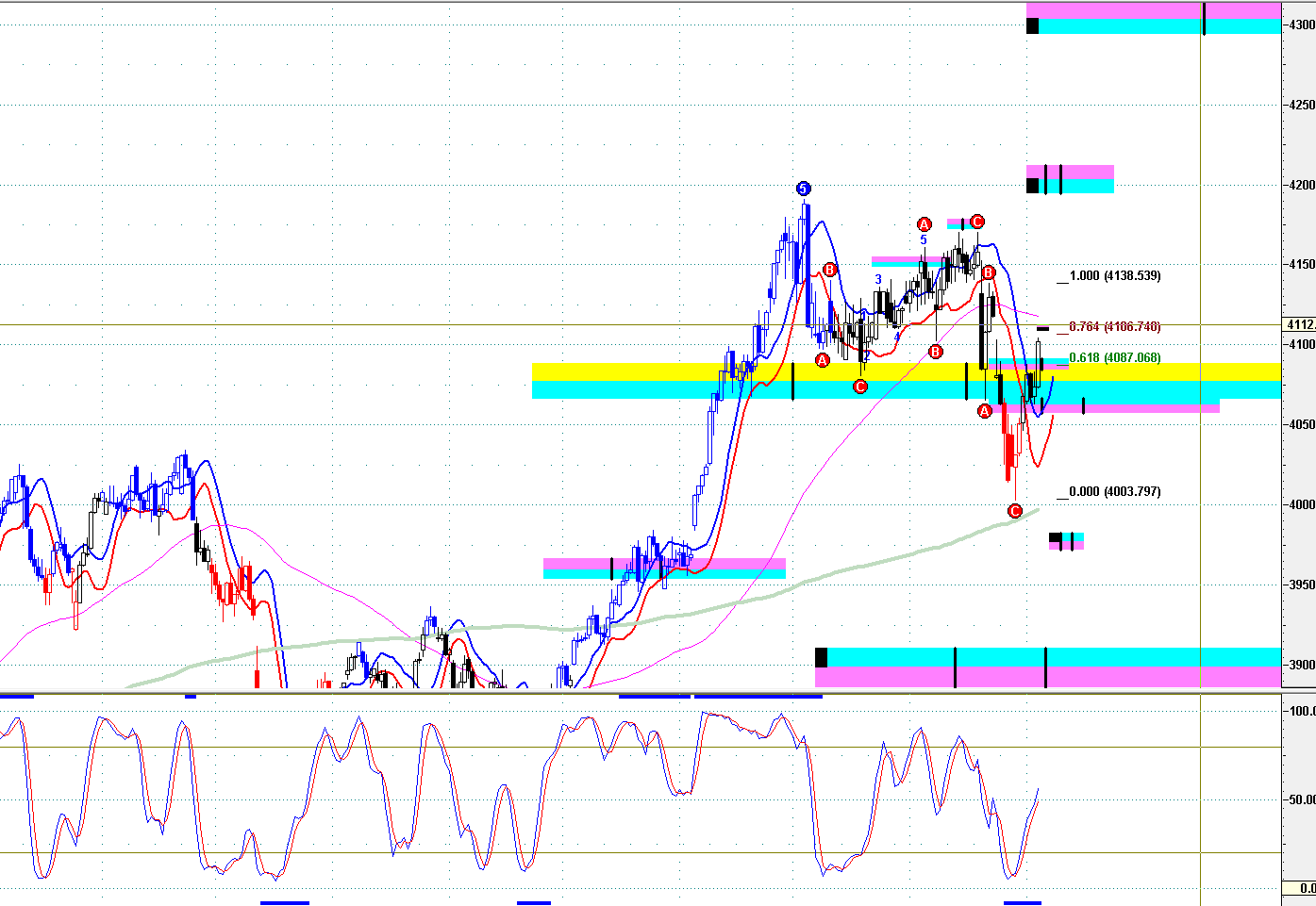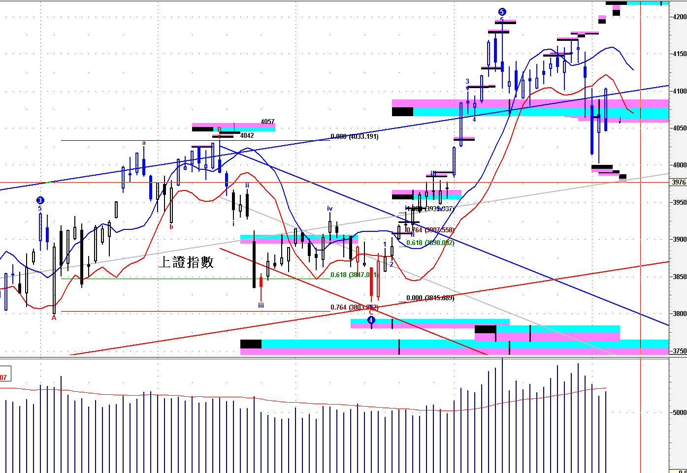 ==》保持 4065 之下,結束短線上升,開始短線回吐 ;