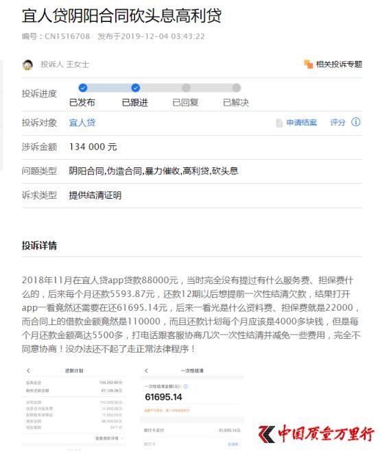 事实上,申先生并不是第一个表示宜人贷存在阴阳合同以及高额信息服务费的,同一天,王女士也在聚投诉平台表示自己2018年11月在宜人贷APP贷款88000元,分24期还清。事后发现自己的合同借款金额是11万元,而信息服务费和前期保障金加起来竟然高达2万2千元。王女士表示自己无法接受要走正常的法律程序。