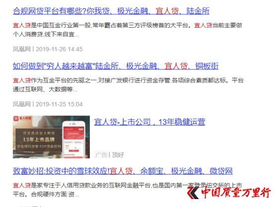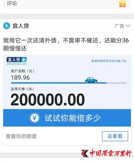 记者会调查发现今年以来宜人贷在互联网多个平台发布贷款广告,有门户网站发布了多条推广软文,QQ空间中也出现了宜人贷的相关广告。其中宜人贷以“不面审、不催还”等作为广告语,吸引了一大批用户。
