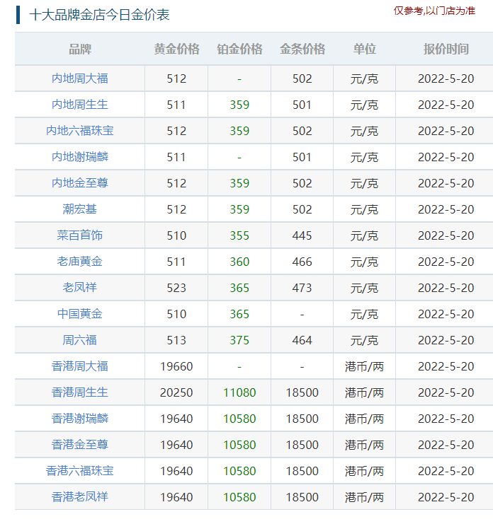 今日周大福今日金价512元/克,六福黄金今日价格512元/克,周生生今日金价511元/克,金至尊最近金价512元/克,谢瑞麟今天金价511元/克,老凤祥今日黄金价格523元/克,老庙黄金价格511元/克,菜百今日金价510元/克,周大生目前金价512元/克,中国黄金价格元/克,金大福金价510元/克,潮宏基黄金报价512元/克,周六福金价今日价格513元/克。