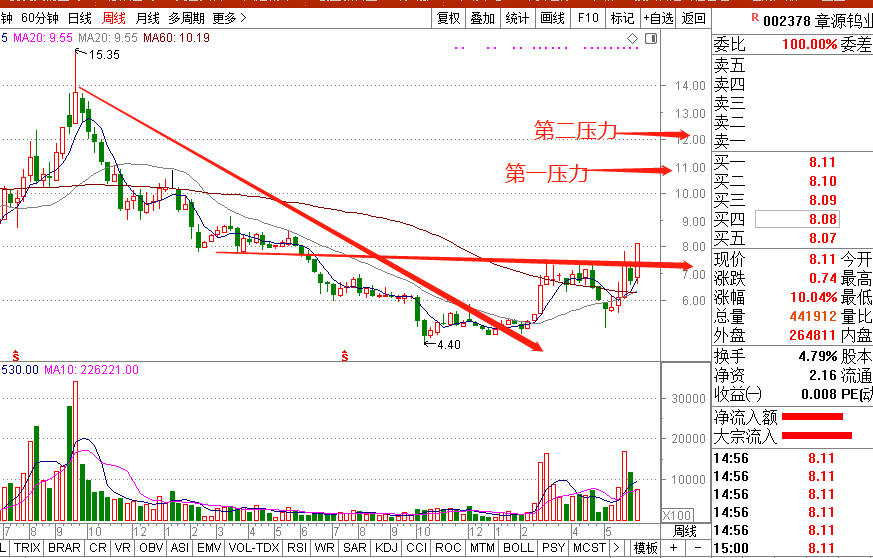 涨幅居前的板块是基建行业相关的水泥板块,白酒再次雄起,没办法我们几千年的文化都和酒有关,只要嗨皮就要喝酒,玻璃板块受到期货影响期货玻璃涨停,所以玻璃相关行业个股强势反攻,耀皮玻璃、德力股份封板。最值得关注的当属稀土永磁概念,今天稀土永磁概念有17只个股涨停封板,我早上推送的300224完美封板,所以收盘没有在稀土里面筛选个股,但是稀有小金属章源钨业002378进入我的法眼,周线级别和日线级别共振,日线突破盘整区间所有的高点,第一目标黄金分割点10.2附近,话不多说上图,有参与的朋友注意控制风险,做好仓位资金管理。