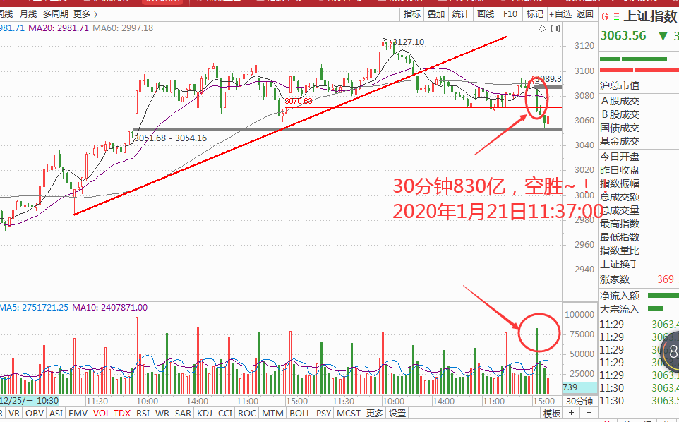 早盘开盘直接跳空,依旧是真没有任何症状没有任何消息利空,但是没有办法,技术图形的跳空低开让我对15分钟趋势放量非常敏感,早盘15分钟、30分钟成交额525亿,空头强,这个进攻量快速的击穿了60分钟均线的支撑点位3065点,到达了上周一给出的第二支撑点位3050点附近,然后开始反攻。这个点位是无敌量跳空缺口位置,目前看只有微小的3个点的跳空支撑,如图:
