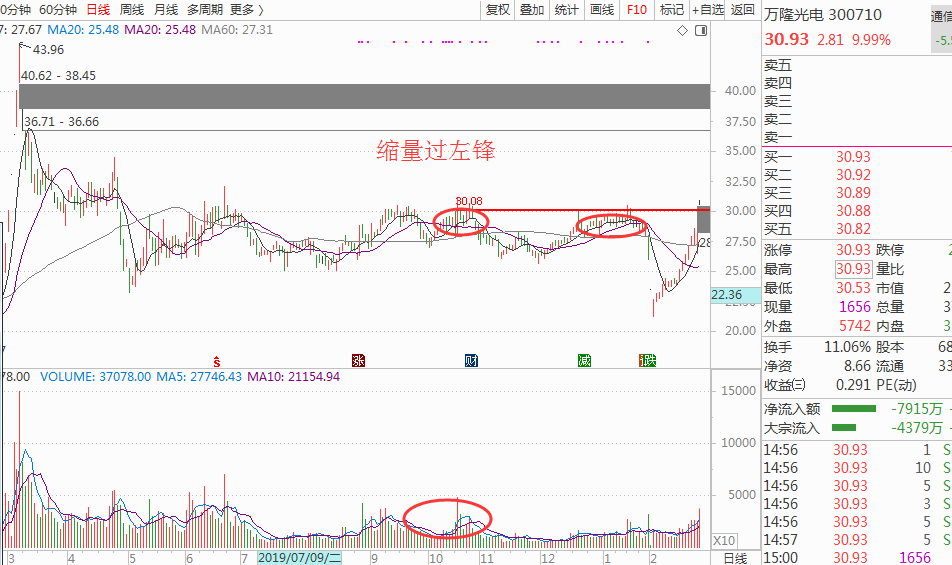 今天高位股是风险加剧,目标转向低价刚刚启动的方向,腾达建设600512业绩同比增长2000%以上,可重点关注,万隆光电300710缩量过左锋,今天如果在4%以内可以重点关注,如图: