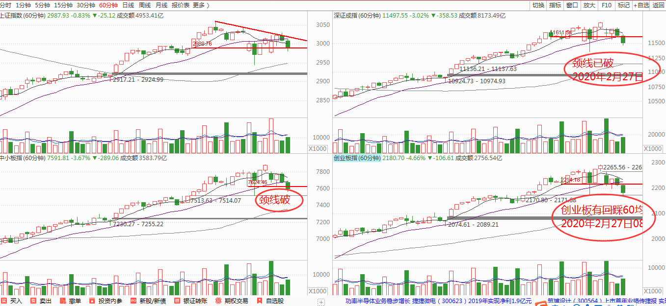 而做到这些最基础的就是进行推演,我们组交易如同统兵打仗,每个细节也是不能忽视的,就像在2月18日出现第一次放量回调,和第二次24日的跳空下跌都是极其准确的警示信号,所言在直播时候提醒要做好资金管理冲高减仓是必须要执行的操作,昨天的行情中小创指数弱于主板,注意今天有可能延续昨天走势,直播提醒减仓的朋友们不要急于加仓,等15分钟企稳信号,如图: