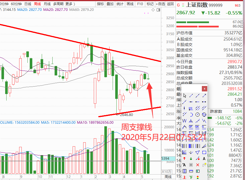 按照常规美股外盘暴跌,今天大A低开概率较大,但是大A韧性反复折腾后是否持续这种韧性还是顺势下跌?我觉得今天低开顺势下跌的概率大些,时间上今天是震荡盘整的第11个交易日,窗口有选择方向的概率,这样的话低开最后打击交易参与者的心里,在午间组织反攻最好,这样可以持续到下午收盘,不至于周线收的太难看,如图: