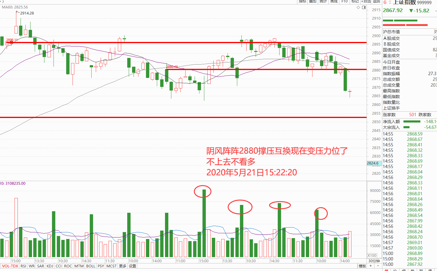 说话间高位震荡盘整已经有两周时间了,从第一周出现高位阴线量到2910冲击0.618下破坐实回调,再到小级别下破震荡回调,虽然周三周四都有反弹,很明显反弹无力,直播时候我也是极力提醒朋友们不要急于进场,给出的支撑点位2870点、2850点,到了2870的时候有朋友有幻想,我醒没有15分钟信号不算止跌,眼看着今天周五,2850点会不会就在这里筑底了呢?