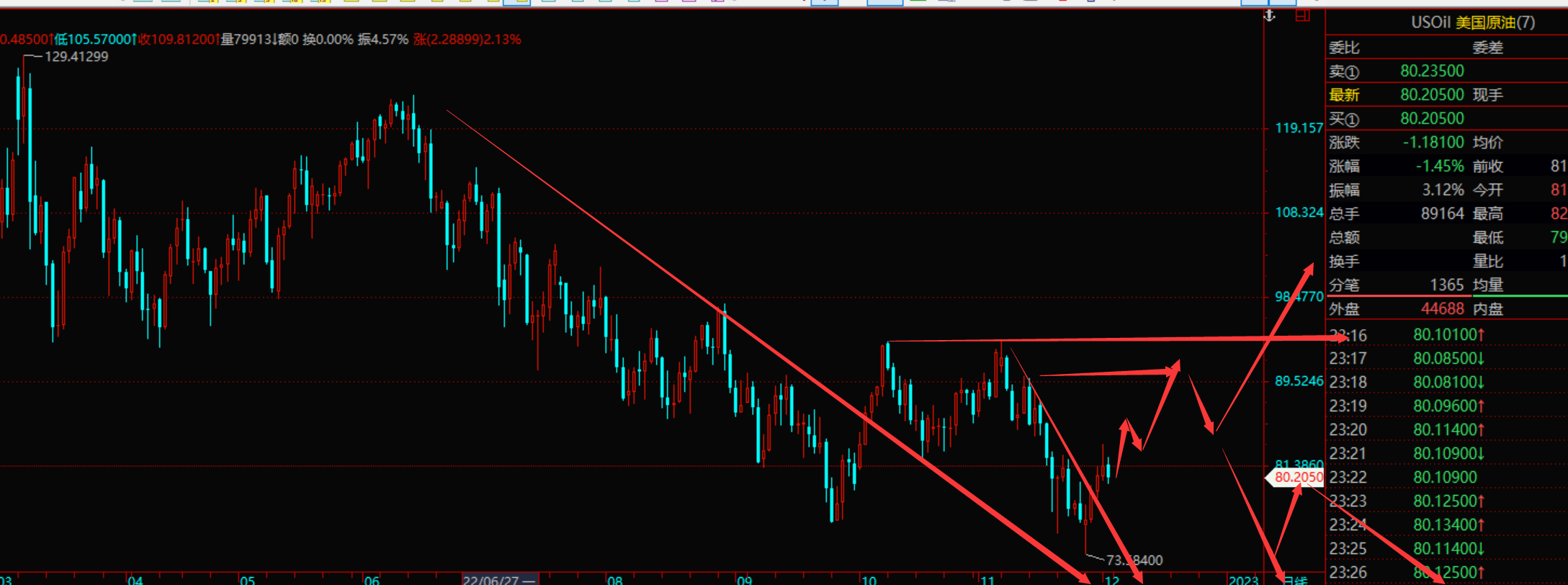 技术面上,本周原油整体如预期走了探底回升的结构行情,本周23号低点转折之后我们就是持续看多为主,整体看多到12月中旬的思路不变,所以下周整体还是进一步的看多为主。但如果下周下破73.55美元的支撑整体就要调整思路逆推看空,但这个概率比较低。当下虽然看多,但是发现布油并没有突破下降趋势,好在美原油突破了下降趋势,整体走出了结构性的多头。所以下周还要观察布油的突破也是关键。下周核心重点看83.3与73.55的区间突破,如果向上整体将加速看多到90美元 ,本次的目标我认为也是看多到90美元,但如果有更大的突破,就是极限值在94美元的为目标。不下破就是持续低为主,预期下周趋势路图: