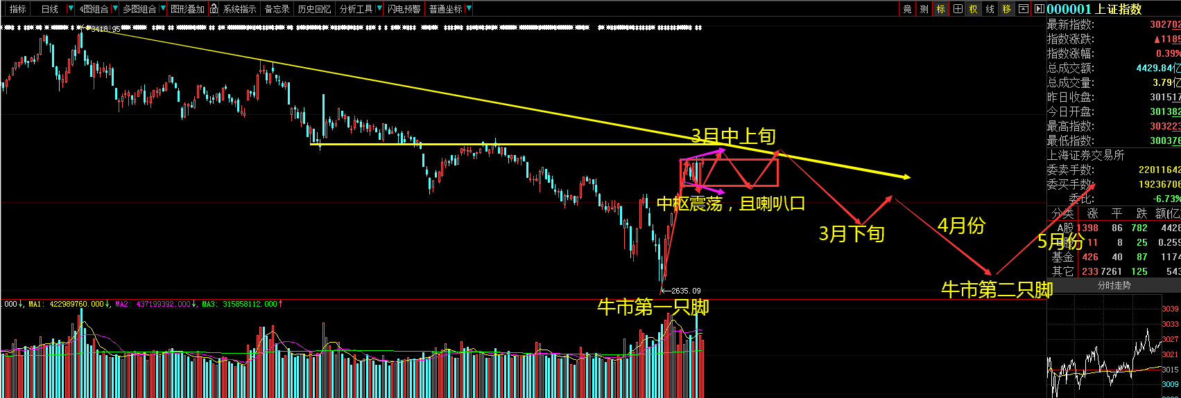 综上所述,春节前至今,市场展开的强劲反弹波,应并不能一次性的彻底完成超级大底的构筑,正常情况下,还会有反复的过程。最完美的走势结构,就是在三月中上旬构筑顶部形态后,在后面的4月分再调整一波做牛市的第二只脚,随后五月份再次启动,才能彻底终结始于2015年6月5178点开始的漫长熊市,进入到崭新的牛市结构。