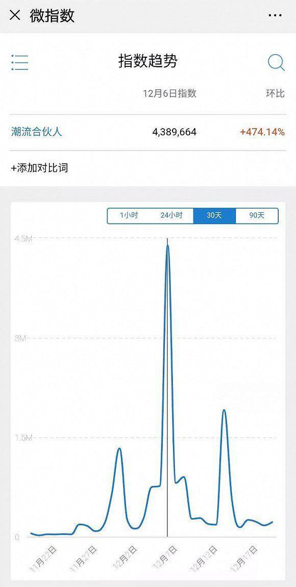 12月6日,《潮流合伙人》上线后,蓄势充足的节目随即成了大众焦点。截至12月19日,《潮流合伙人》播出两期,微博指数峰值已经达到438万。节目播出期间更是产生50个话题登上微博话题榜,刷出#吴亦凡接机潘玮柏#、#潮流合伙人太上头了#等26次微博热搜,相关话题阅读量累计达到20亿以上。