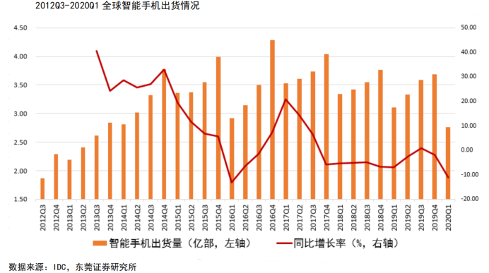 17Q4 至 19Q2,全球智能手机季度出货量分布为 4.04、3.34、3.42、3.55、3.76、3.11、和 3.33 亿部,同比分别下降 5.83%、5.38%、5.11%、4.80%、6.82%、6.95%和 2.57%,连续 7 个季度同比下滑。19Q3 和 19Q4 全球智能手机单季度出货量分别为 3.58%和 3.69%,相比上年同期分别变动 0.87%和-1.86%,下滑幅度有所放缓。然而,于 19 年底开始出现的新冠疫情对智能手机终端销售造成较大冲击,而我国作为全球最重要的智能手机生产基地,由于春节后复工推迟、交通物流受阻等因素,电子零部件生产效率也有所降低。