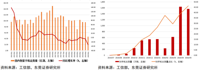 5G 出货占比迅速提升,已成在售机型主力产品。自国内首款 5G 手机于去年 7 月开售以来,5G 手机成为各大厂商的竞争焦点,各家手机厂商纷纷推出支持 5G 通信的手机新品,5G 产品占比迅速提高。根据工信部数据,今年 1-5 月国内上市新机型累计 65 款,其中5G 手机占比达到 47.4%;从出货量角度看,今年 1-3 月国内 5G 手机累计出货量为 468.67万部,占手机总出货量比重为 29.20%,而 2020 年 5 月手机市场总体出货量为 3,357.9 万部,其中 5G 手机出货 1,564.3 万部,占同期手机总出货量的 46.3%,已成为在售机型的主力产品。随着国内 5G 建设加速推进,我们预计手机厂商将加快推广 5G 手机,带动全球智能手机市场触底反弹。