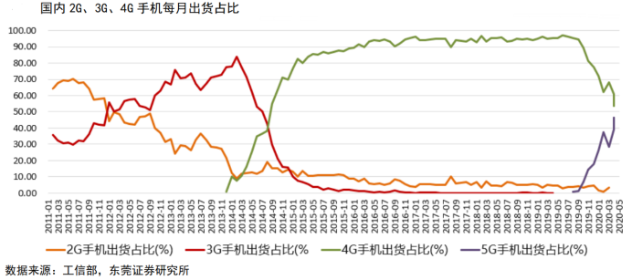 回顾国内 4G 发展历程:通信技术迭代升级对用户换机有明显拉动作用。2012 年 12 月,工信部向三大运营商发放 TD-LTE 牌照,标志我国正式进入 4G 时代。三家运营商从 2014年开始大规模建设 4G 基站,随后两年 4G 手机出货占比迅速提升,在发放牌照后一年出货占比接近 70%,两年接近 90%,形成明显的换机效应。从 4G 发展历程看,发放通信牌照后的两年内是智能手机更新换代的高峰期,支持新一代移动通信技术的智能手机出货占比迅速提升。