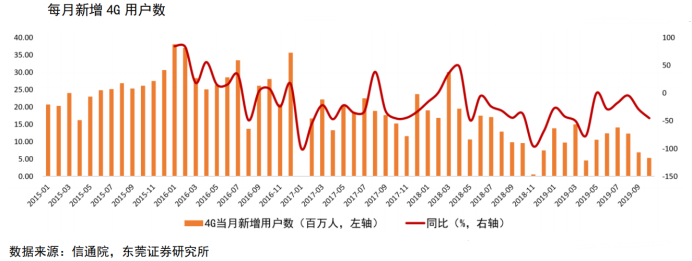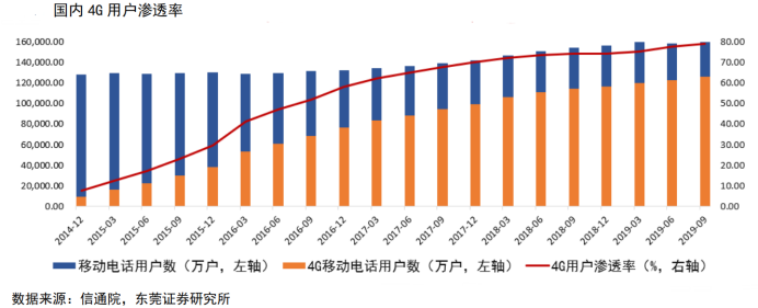 4G 用户渗透情况:发放牌照三年内为用户快速渗透期。从 4G 用户增长情况看,我国 4G 用户渗透速度慢于 4G 手机渗透速度,发放牌照后一年我国 4G 手机用户累计达到9728.40万人,渗透率为 7.56%;发放牌照后两年内 4G 用户渗透率接近 30%,发放牌照后三年渗透率接近 60%。截至 2019 年 10 月,我国 4G 移动电话累计用户数达到 12.69 亿,渗透率为 79.36%。由此可见,发放 4G 牌照三年内为用户快速渗透期,随后 4G 用户渗透速度趋缓。