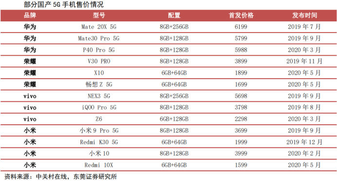 我们对市场已发布的 5G 机型进行梳理,发行国内 5G 首发价格大多介于 3000-8000 元之间,相比同配置的 4G 版本贵 500-1000 元,低于市场此前普遍预期的万元水准。其中,于 2019 年底发布的 5G 双模手机 Redmi K30 5G 起售价仅为 1999 元,成为第一款 2000 元档 5G 手机;于今年 5 月发布的荣耀畅想 Z、Redmi 10X 起售价分别为 1699 和 1599 元,标志着 5G 手机价格下探至 1500 元档位。