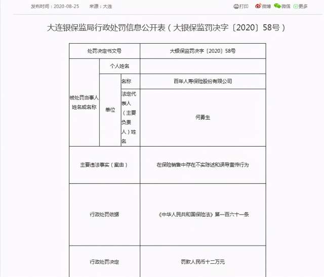 8月25日,百年人寿在保险销售中存在不实陈述和误导宣传的违法违规行为,被大连银保监局罚款12万元,对两名相关责任人路琰及朱丽分别罚款4万元。