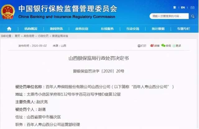 9月2日,百年人寿山西分公司因立案理赔违规被罚20万元,公司运营部经理赵倩给予警告,被罚4万元。