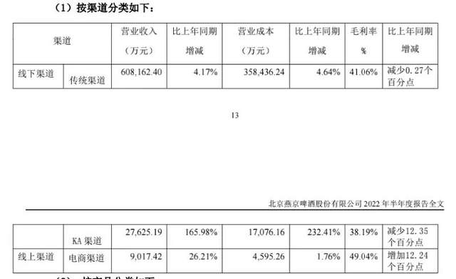 隐患在于,受营业成本压力,燕京啤酒线下渠道毛利率出现不同程度下滑。期内传统渠道营业成本同比增长4.64%,毛利率同比下降0.27%;KA渠道营业成本同比增长232.41%,毛利率同比下降12.35%。