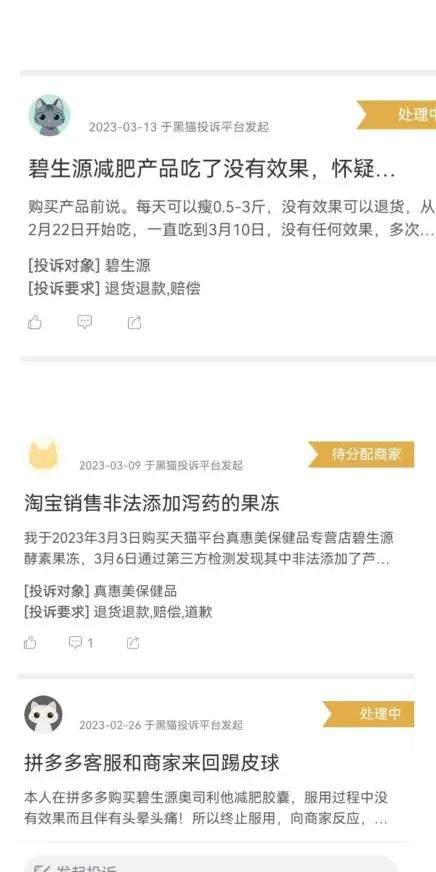浏览黑猫投诉,投诉量仅19条,数量真心不多。但内容多聚焦减肥产品无效、非法添加泻药等质疑。