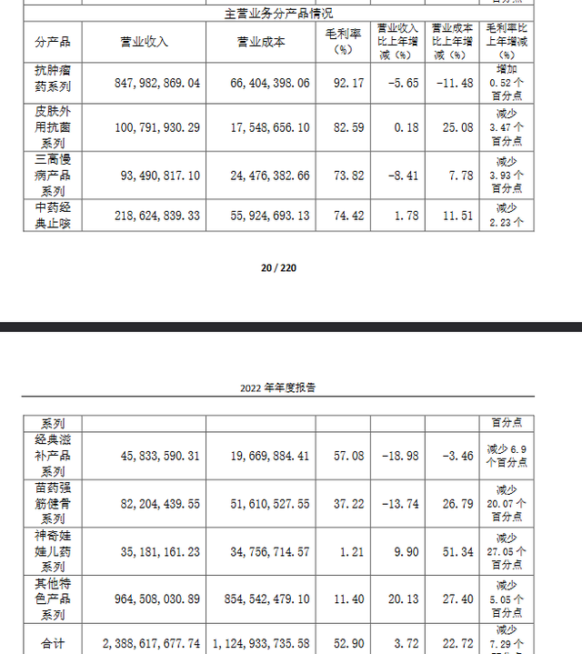 抗肿瘤药系列、三高慢病产品系列、经典滋补产品系列、苗药强筋健骨系列营收分别约8.48亿元、9349万元、4583万元、8220万元,同比下滑5.65%、8.41%、18.98%、13.74%。