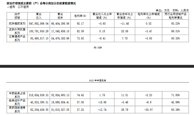 毛利率也不容乐观。按治疗领域或主要药(产)品等分类划分,只有抗肿瘤药系列的毛利率为92.17%,同比增长0.52%。其余皮肤外用抗菌系列、三高慢病产品系列、中药经典止咳系列、经典滋补产品系列、苗药强筋健骨系列的毛利率分别为82.59%、73.82%、74.42%、57.08%、37.22%,同比下滑3.47%、3.93%、2.23%、6.9%、20.07%。
