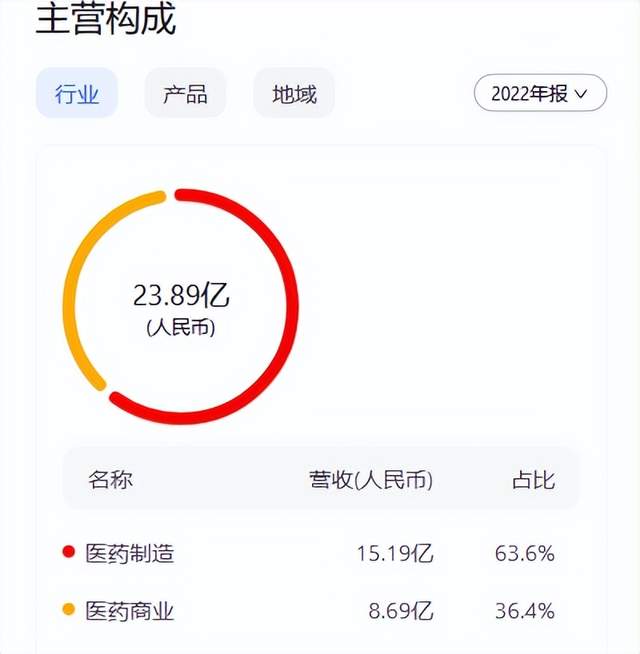 深入业务层面,神奇制药营收主要分为医药制造和医药商业两大板块。2017年前者收入占营收比73.27%,后者占比26.73%。2022年两者营收共计23.89亿,占总营收比分别为63.6%、36.4%。